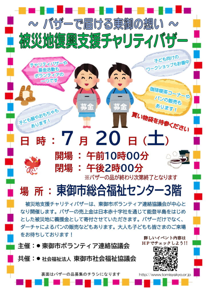 東御市ボランティア連絡協議会が中心となり、被災地復興支援チャリティバザーを開催いたします。