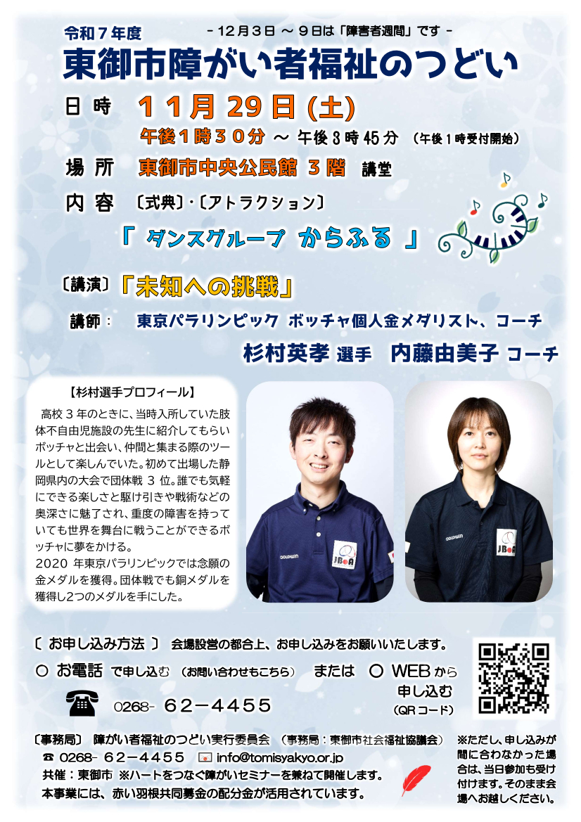 第22回東御市障がい者福祉のつどいを開催します 2025年11月20日 未分類 by 東御市社会福祉協議会. ↓ 翌30日(日)には、とうみボッチャ第10回記念大会&ボッチャクリニックも開催されます。 ◆ 11月30日(土)とうみボッチャ 前の記事